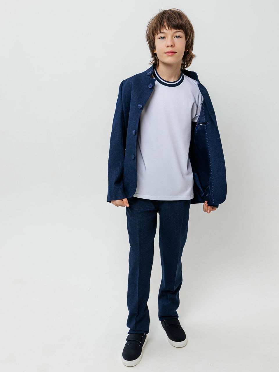 Мальчик: Базовый лонгслив темного цвета + классические брюки чинос или джинсы темного оттенка (если разрешены) + кроссовки или ботинки.