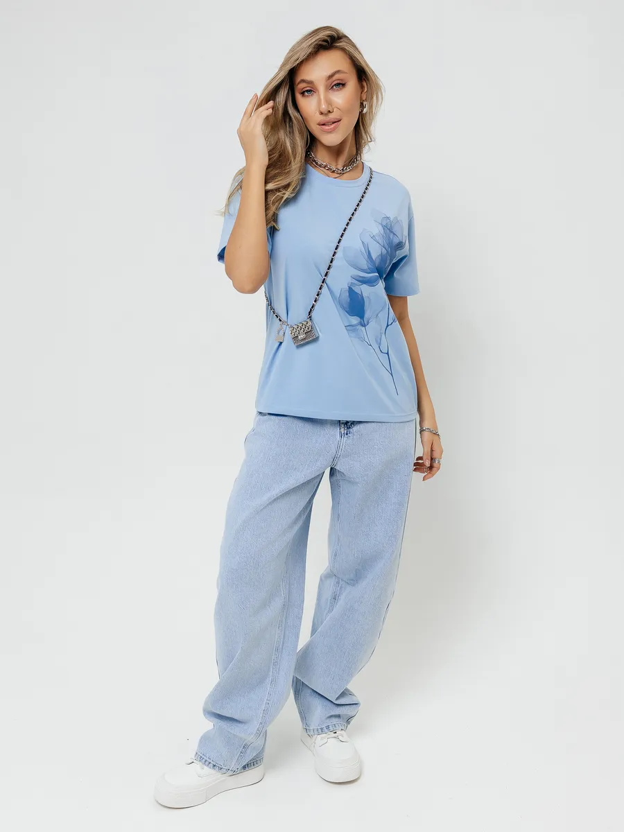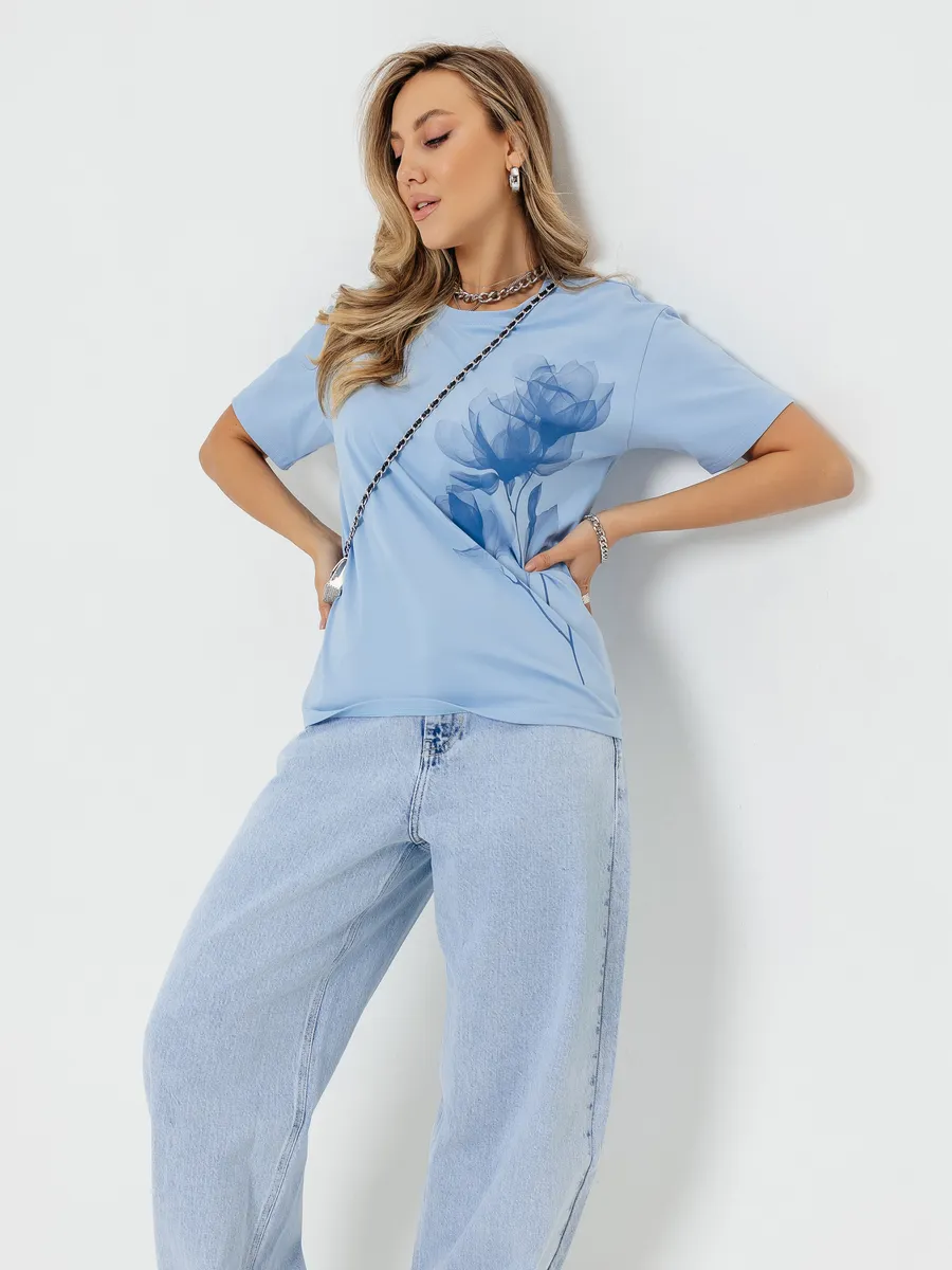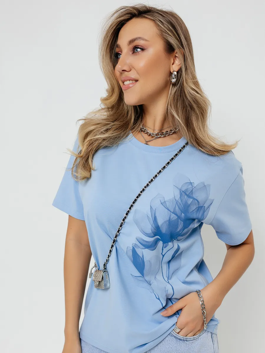 Женская футболка из кулирной глади с лайкрой, с эффектным акварельным принтом. Стильная футболка из качественного однотонного трикотажного полотна. Не теряет формы, не закатывается. Качество полотна пенье, плотность 160 г/кв.м., легкая, очень мягкая и приятная к телу. Для молодых девушек и стильных женщин.