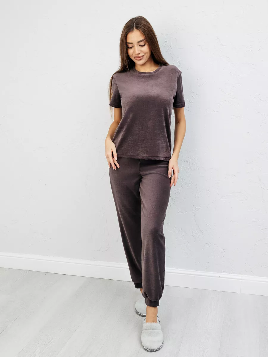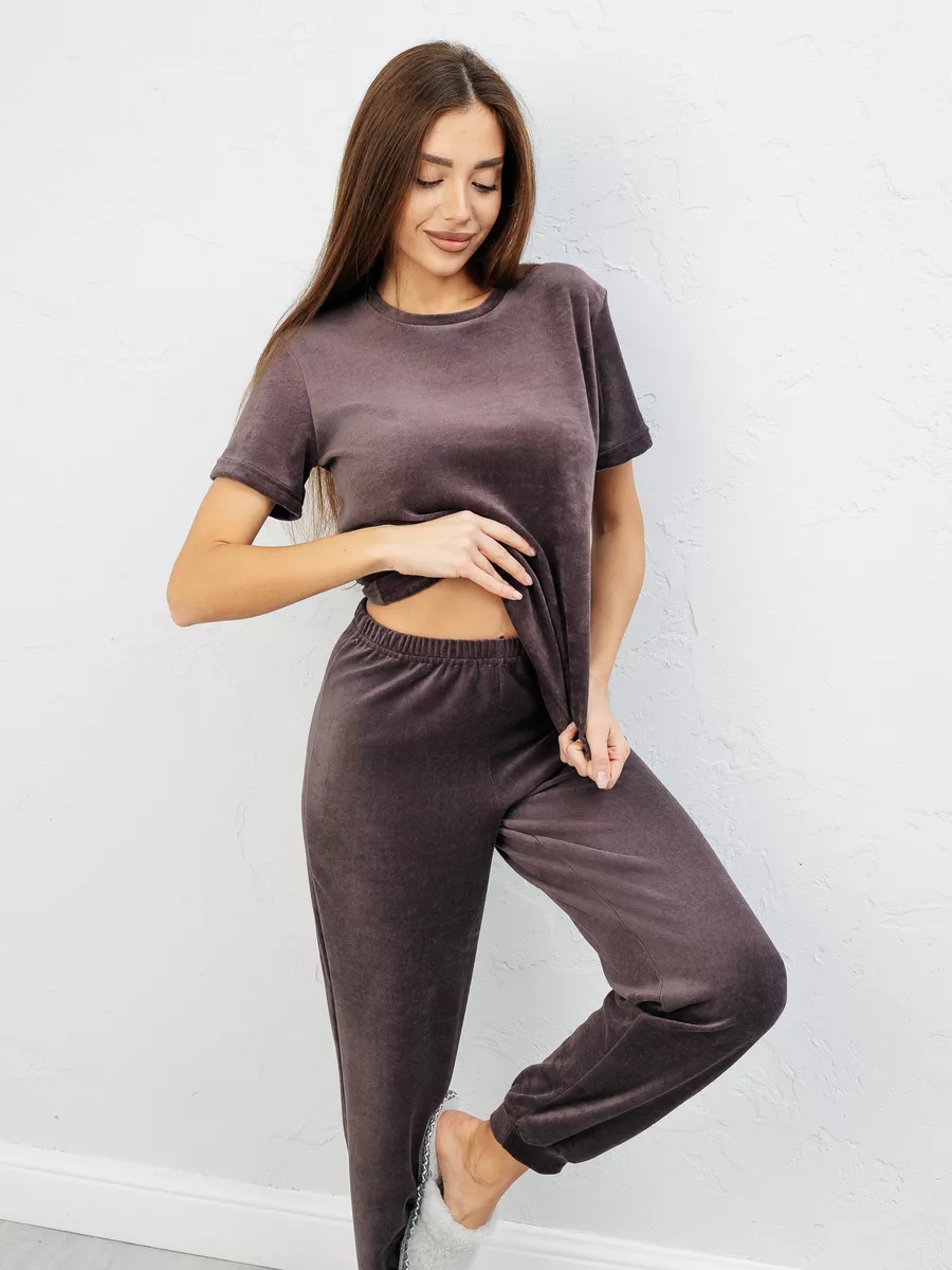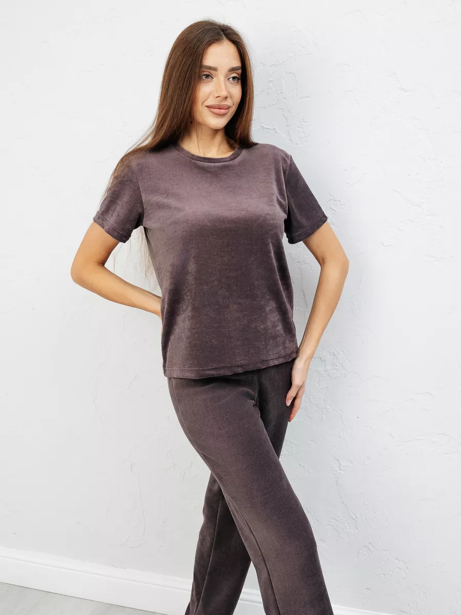 Костюм женский из велюра, брюки + футболка, однотонный