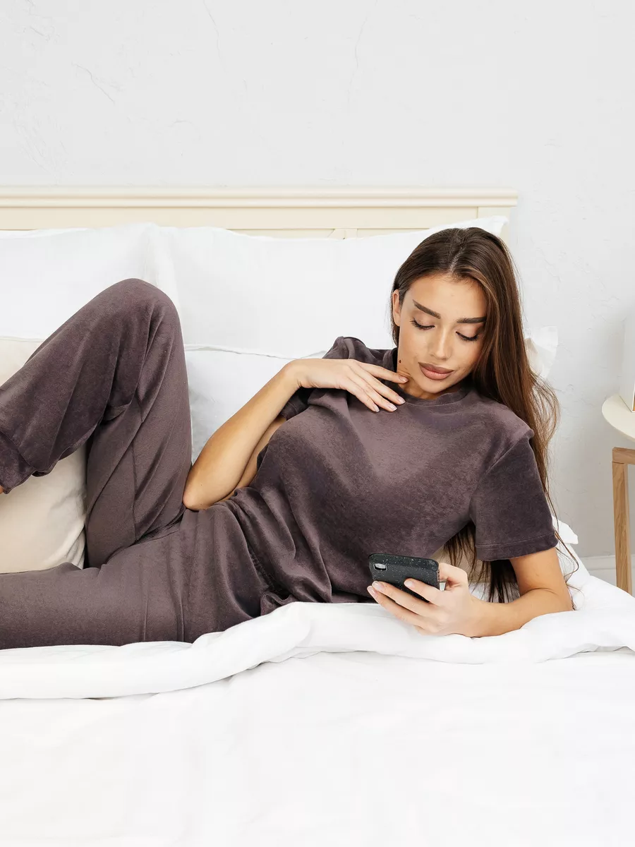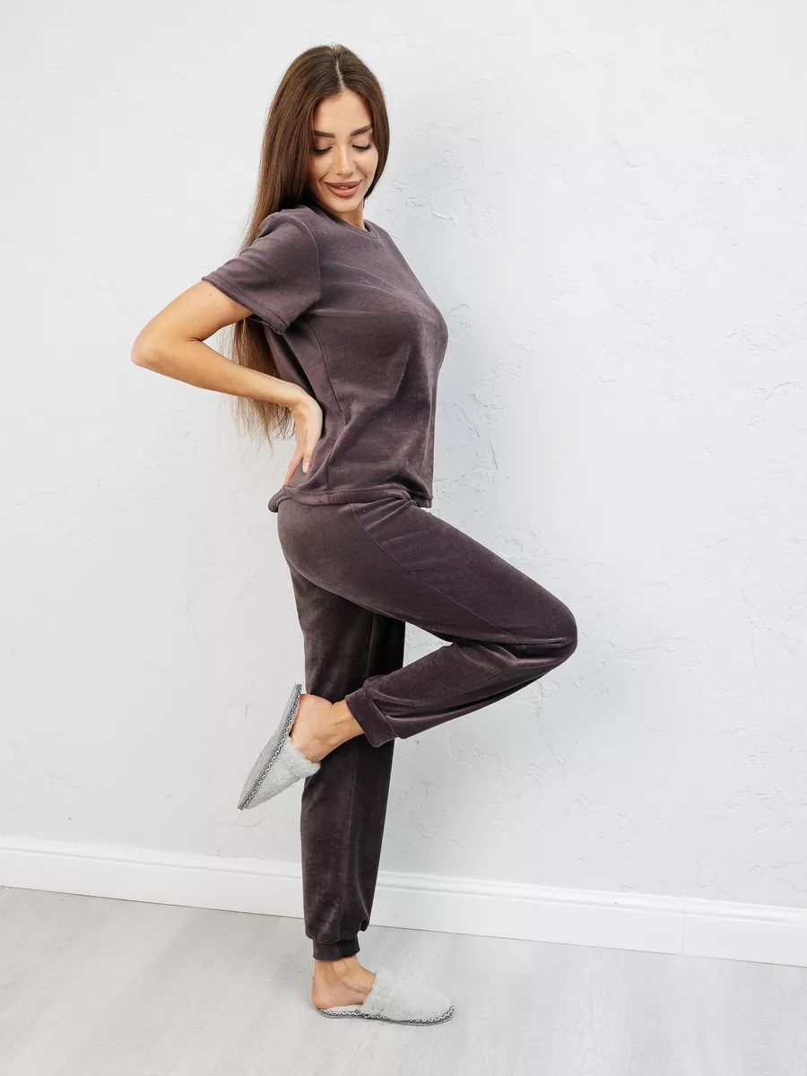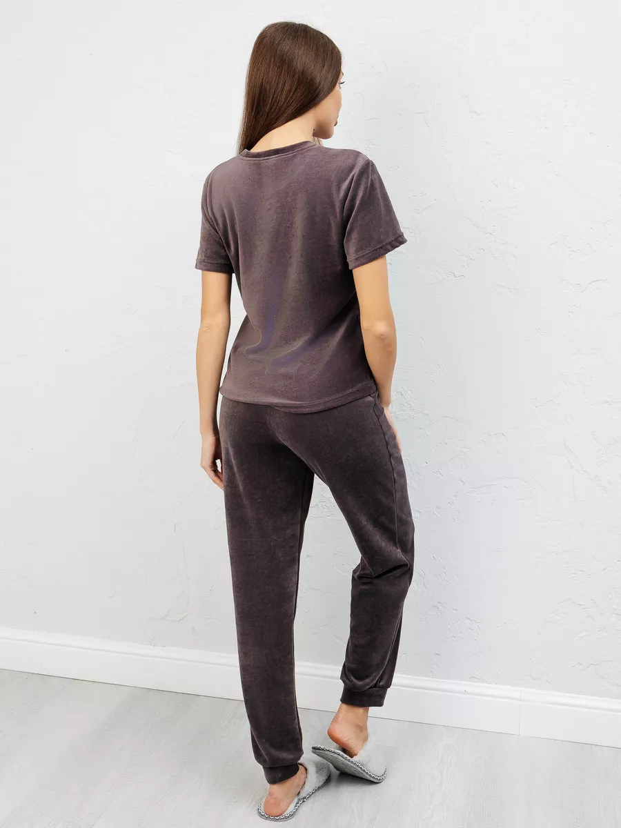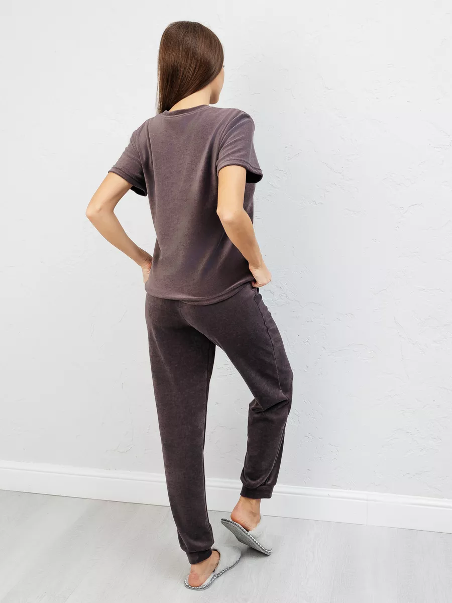 Костюм женский из велюра, брюки + футболка, однотонный