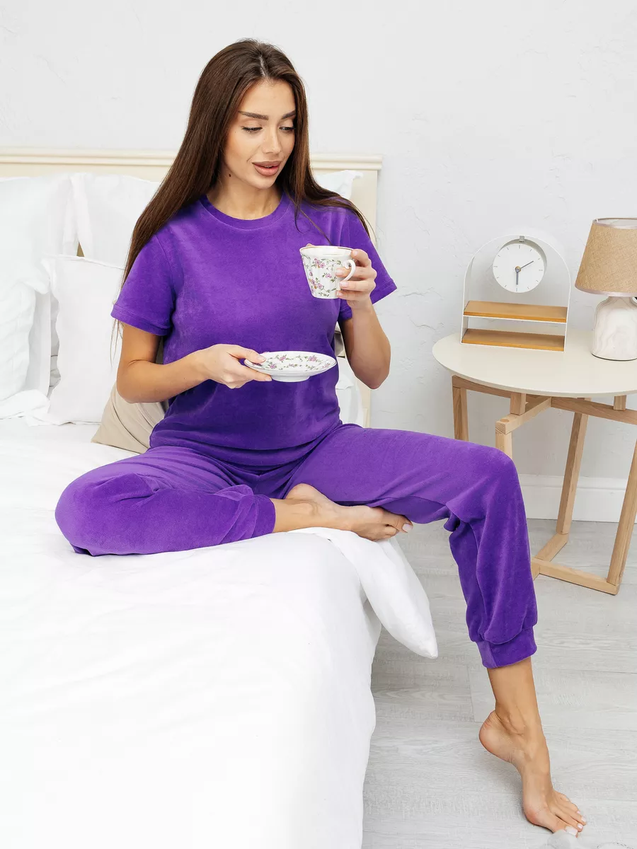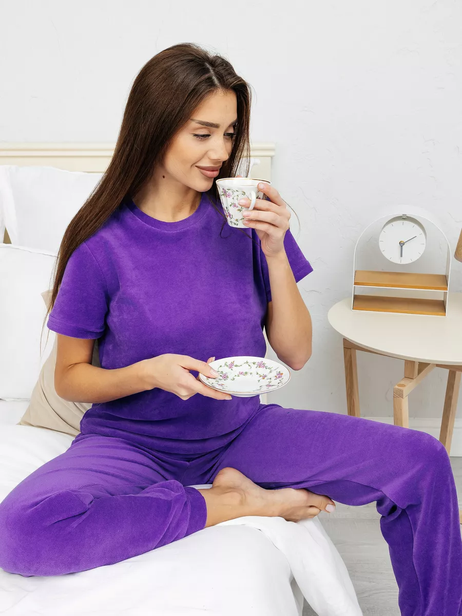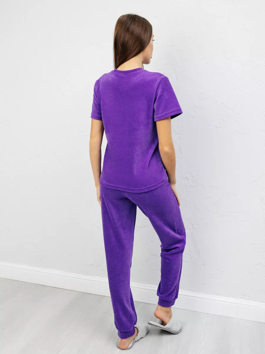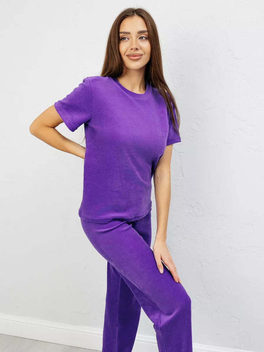 Костюм женский из велюра, брюки + футболка, однотонный